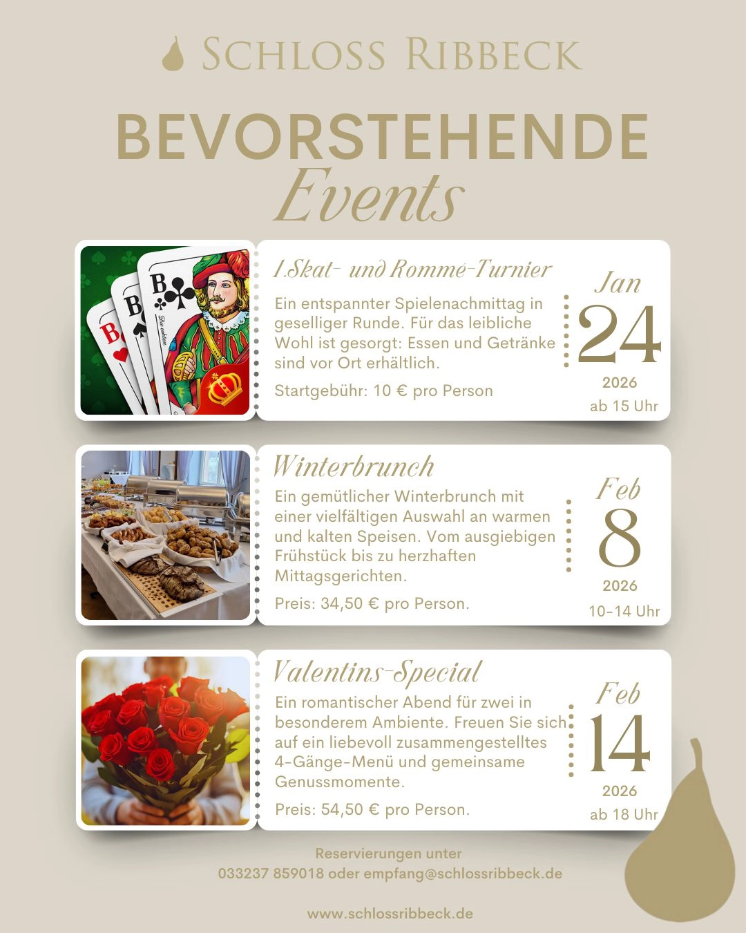 Hier finden Sie aktuelle Informationen rund um Schloss Ribbeck: Unsere Veranstaltungen, neue Gerichte aus der Küche und Termine.
